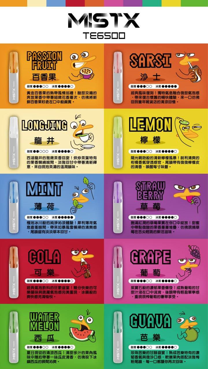 MISTX拋棄式口味 可樂, 檸檬, 沙士, 百香果, 芭樂, 草莓, 葡萄, 薄荷, 西瓜, 龍井